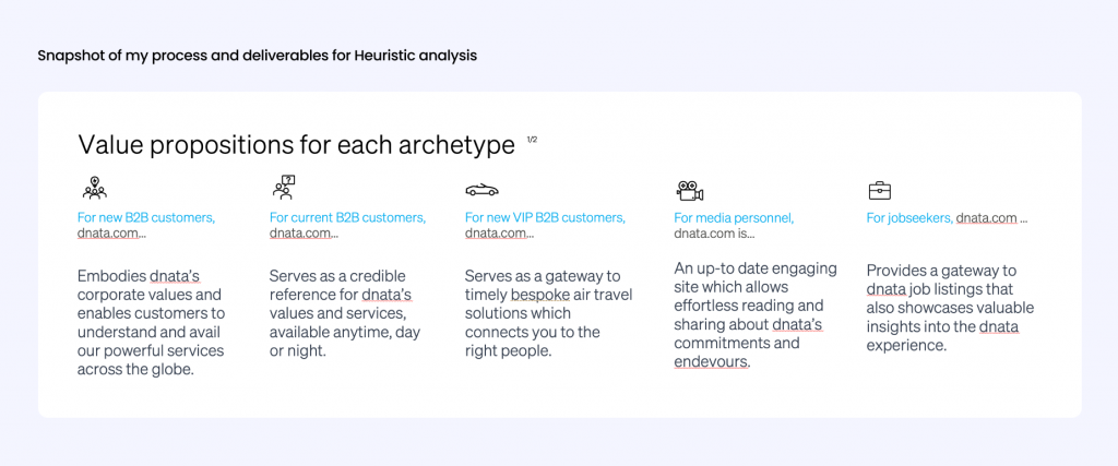 The data (14+ responses) gave us richer insights into what the problems were for each service category and user groups. This was also key in telling us what made dnata different to its competitors.